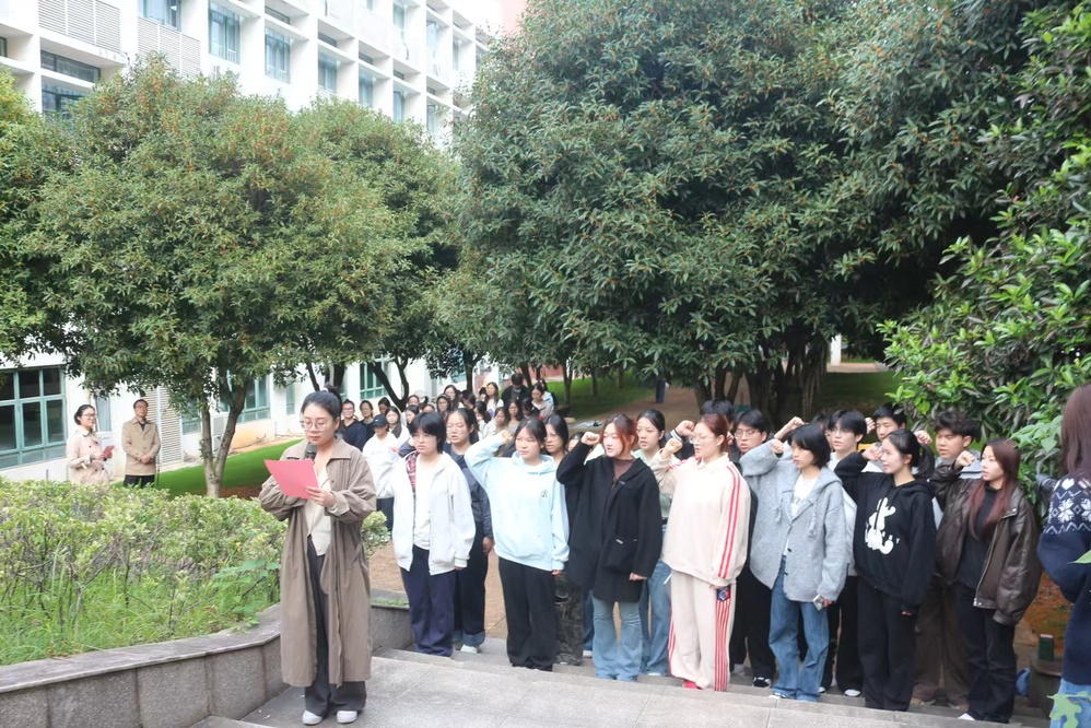 宣讲环节中,青语宣讲团成员叶翼昃以《桂香清远,廉心自明》为题展开分享。她借桂花清雅高洁之韵,巧妙喻廉,从“不慕浮华,坚守本心”“慎微笃行,防微杜渐”到“香润人心,奉献为民”,结合古典诗文与廉洁典故,生动阐释了桂花文化与廉洁精神的内在联系,并号召文旅学子恪守本分、公私分明。随后,在学院组织员方舒的带领下,与会同学郑重宣读《青春清廉承诺书》,承诺将涵养清远之志、恪守俭洁之行、勇担为民之责,展现了文旅青年清正自守的决心。