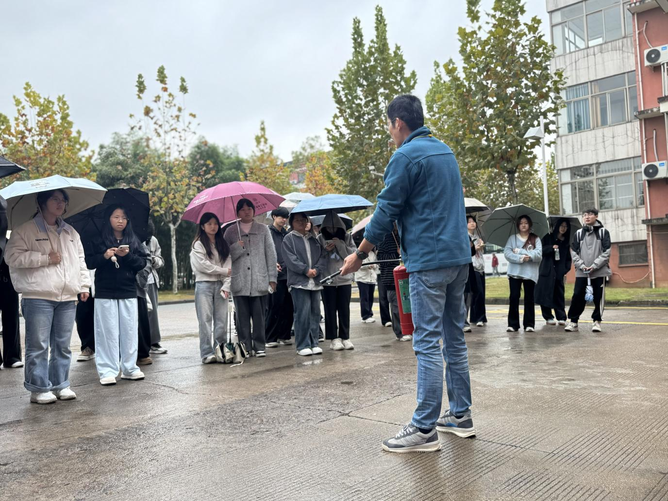中午,文旅学院联合学校安保部组织的消防安全演练正式拉开帷幕。活动特别邀请到安保部经验丰富的陆清东老师现场指导,学院2025级各班级学生代表到场参加活动。演练前,陆清东老师结合校园火灾常见场景,用通俗易懂的语言讲解了灭火器的分类、适用范围及“提、拔、握、压”的正确使用步骤,强调了火灾初期扑救的关键要点和自我防护注意事项。
