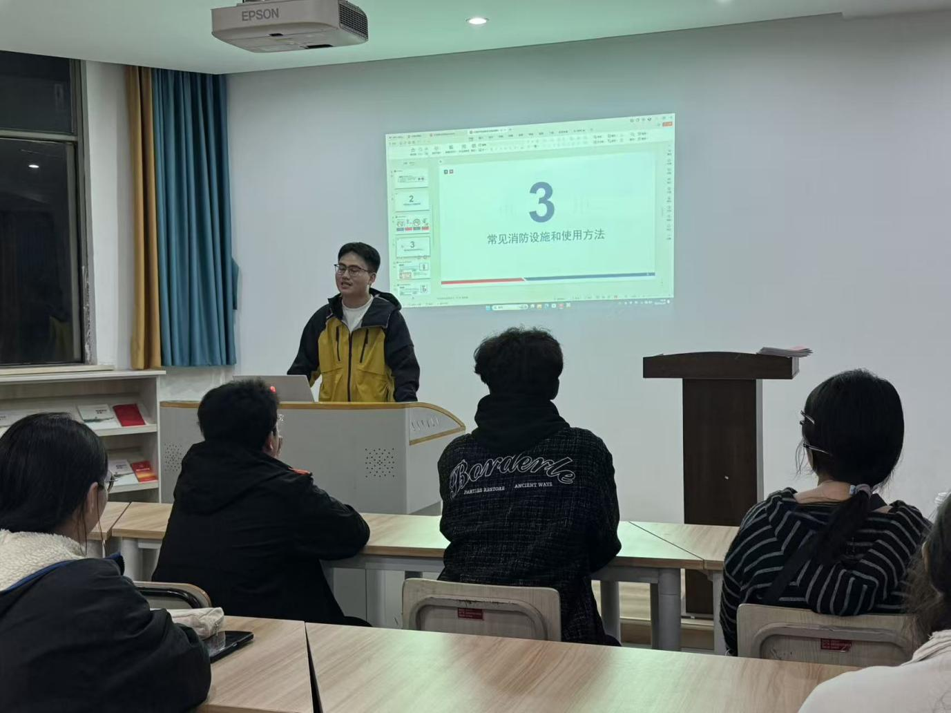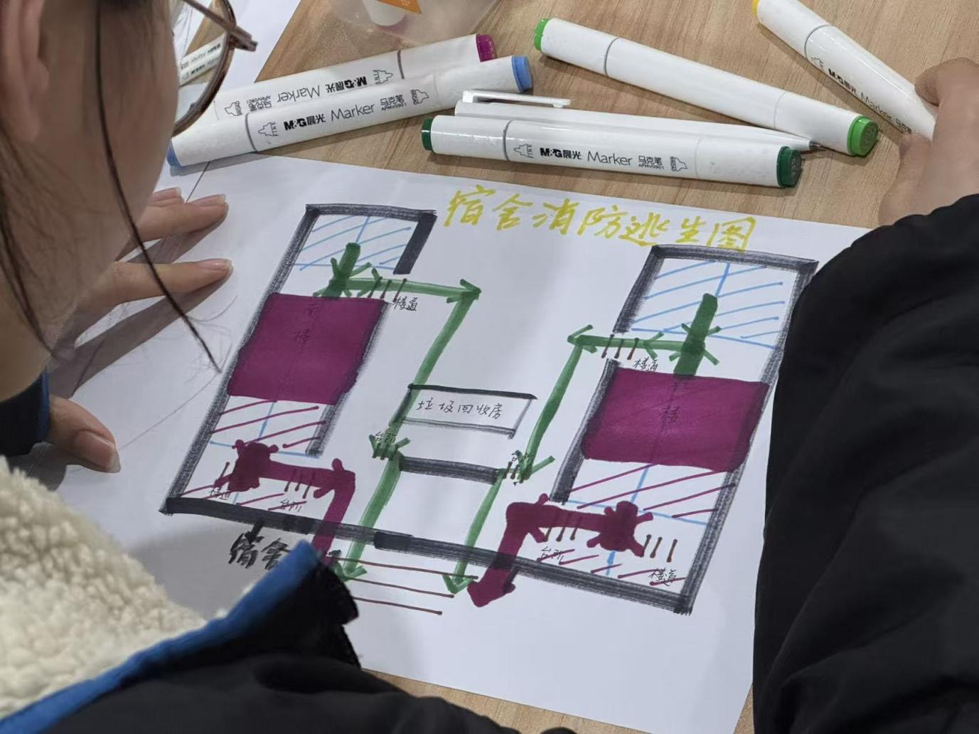 当晚,学院学工办辅导员孙明敏老师为2025级各班级学生代表带来了一堂生动详实的消防安全知识课。课堂上,孙老师围绕校园火灾隐患排查、火灾报警流程、火场逃生技巧、电气安全使用规范等核心内容,结合近期各地高校火灾案例,深入剖析了火灾事故的危害性与防范的重要性。他通过图文并茂的PPT展示、典型案例视频播放等形式,让抽象的安全知识变得直观易懂,同时鼓励同学们积极提问、互动交流,现场学习氛围浓厚。课程尾声,孙老师组织大家分组合作,绘制校园消防安全逃生路线图。同学们结合白天演练的场地布局和课堂所学的逃生原则,分工协作、认真绘制,在实践中进一步巩固了校园消防通道的位置记忆和逃生路线规划能力。2025级学生代表纷纷表示,通过此次活动学到了实用的消防安全知识和技能,今后会自觉遵守消防安全规定,积极参与校园安全建设,共同守护校园平安。