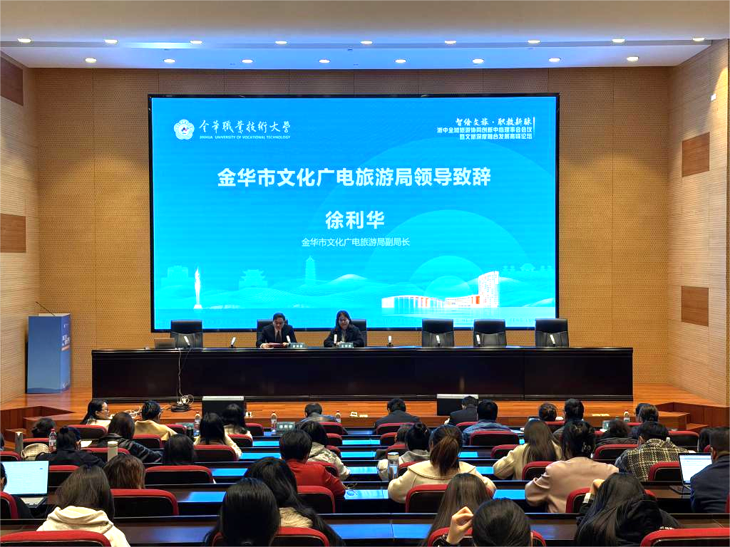 随后,金华市文化广电旅游局副局长徐利华在致辞中表示,《金华市旅游空间布局专项规划 (2024—2035年)》已明确“打造具有国际影响力的文商旅休闲度假目的地”目标,提出“一轴、二廊、三城、二十四片区”市域旅游格局,剑指 2035年实现 1.88亿人次年游客接待量、2360亿元旅游总收入。他提到在全域资源联动、业态创新升级、国际品牌塑造等方面“人才支撑”是破题关键,他希望大家深化交流合作,共同探索文旅深度融合的新路径、产教协同育人的新模式,以文化为魂、以旅游为媒、以人才为基,共同书写金华文旅高质量发展的新篇章。
