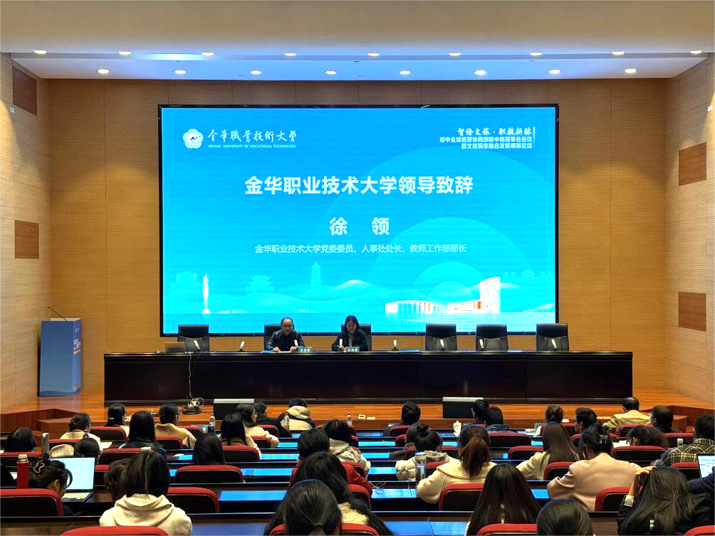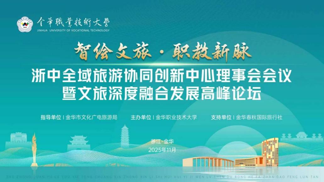 2025年 11月 23日,浙中全域旅游协同创新中心理事会会议暨文旅深度融合发展高峰论坛在金华职业技术大学明德报告厅隆重召开。本次会议由金华市文化广电旅游局指导,金华职业技术大学主办,金华春秋国际旅行社支持,以“文旅深度融合、产教协同育人”为核心,汇聚省内外学界专家、头部文旅企业精英、省内文旅院校师生80余名代表,共探文旅高质量发展新路径。