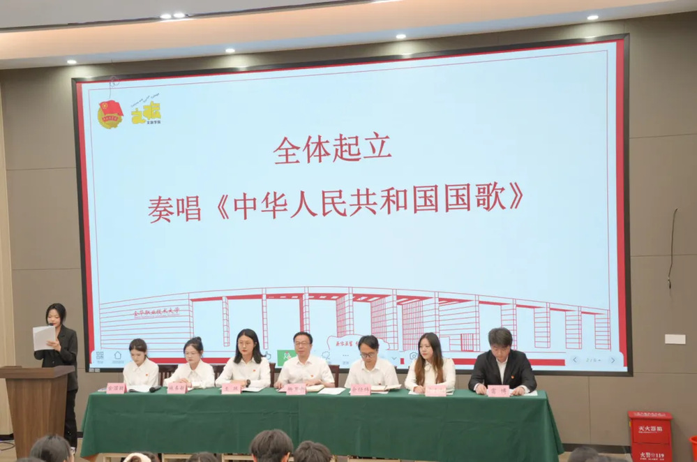 在庄严雄壮的国歌声中,金华职业技术大学文旅学院第一次学生代表大会正式拉开帷幕。学院党委副书记杨卫韵、学院副院长余经纬、学工办副主任陈小双、团委副书记王珏、学院辅导员等领导老师出席开幕式,校学生会和各二级学院学生会主席团代表、学生组织负责人及各班学生代表齐聚一堂,共同见证这一重要时刻。
