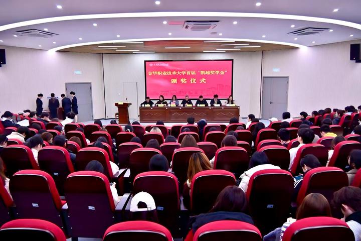 1月15日,金华职业技术大学首届“凯越奖学金”颁奖仪式在初心大讲堂举行。凯越集团人力资源部副总监陈枭龙、副经理曾颖彦,学校教育发展基金会理事长王理凡,以及文旅学院、商学院主要领导与200余名师生代表共同参加。