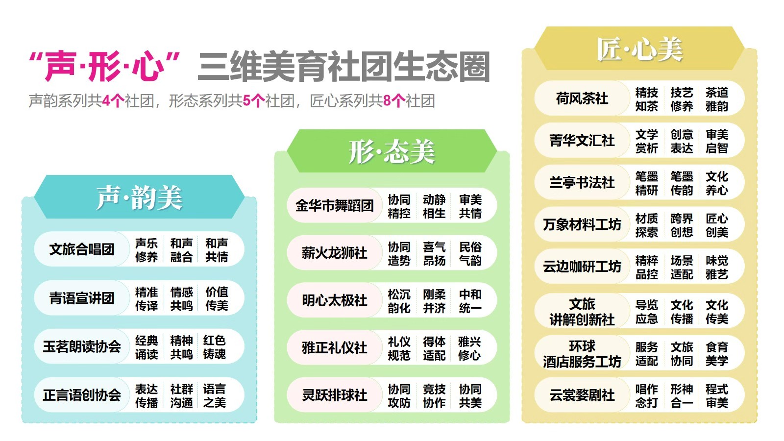 文旅学院充分发挥文化育人功能,塑造具有鲜明文旅印记的校园文化品牌。构建的“声·形·心”三维美育社团生态圈,是一个系统设计、多维融合、阶梯推进的美育实践体系。以“声·韵美、形·态美、匠·心美”为美学维度,对社团进行整合升级,在学院统筹与专家资源协同下,通过“一年入门、两年提升、三年有成”的浸润式培养路径,依托项目制活动与地方文化融合,塑造具有文旅特色的校园文化品牌。